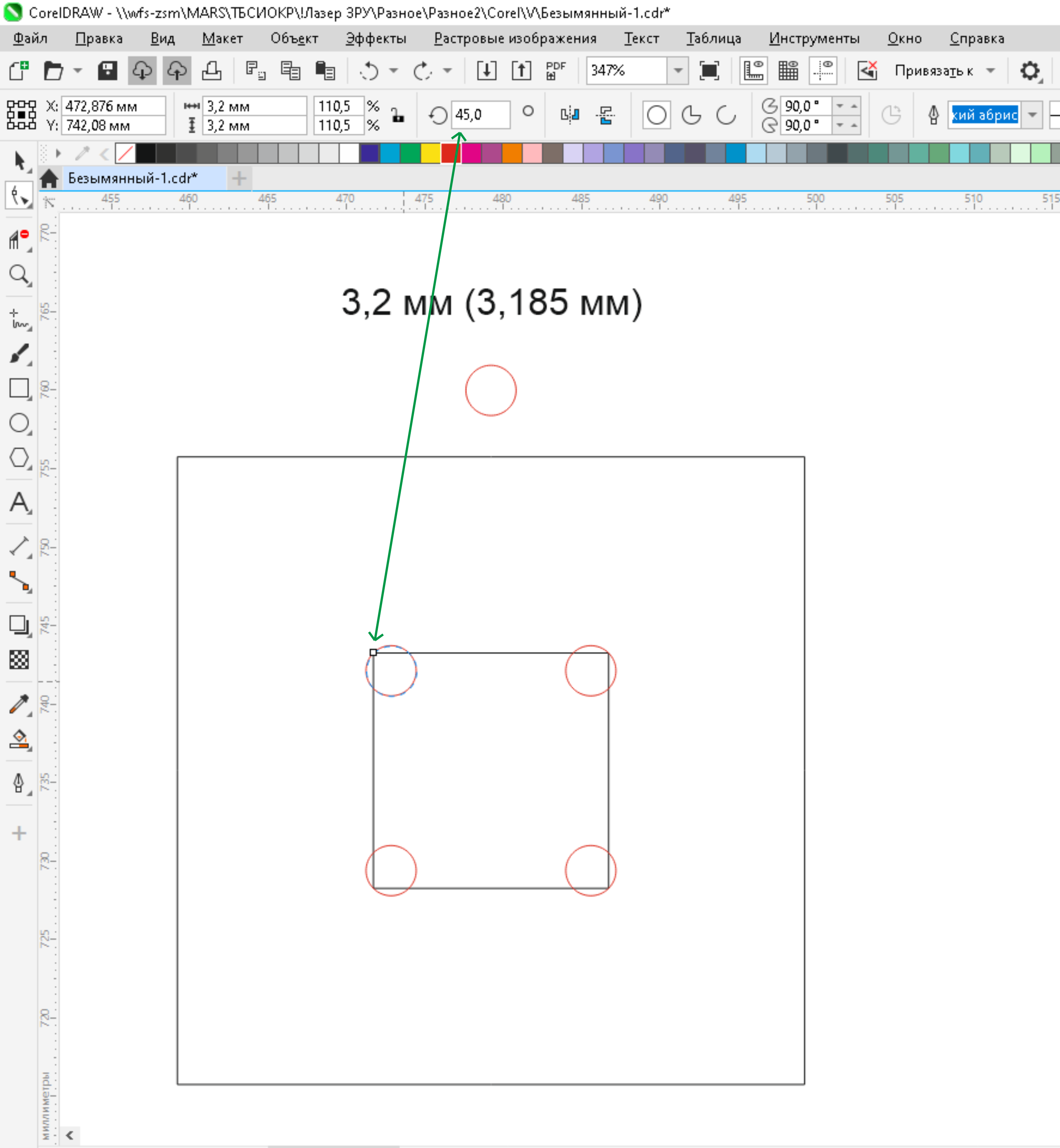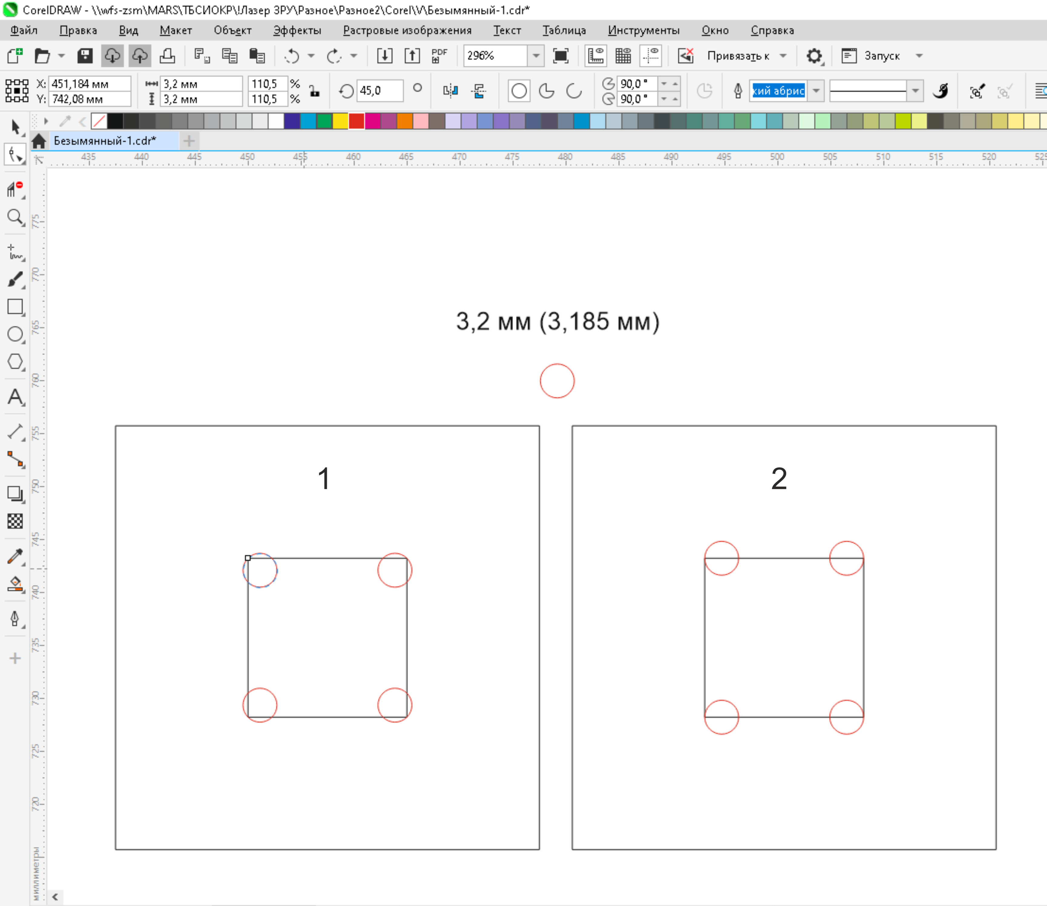 Если требуется сделать внутренний угол, необходимо создать фигуру "окружность" на 0,2 мм больше, чем диаметр фрезы , затем повернуть ее на 45 градусов (для удобства привязки к углам) и расположить во всех внутренних углах (рис. 2). Вариантов расположения "ушек" может быть 2 (рис.3)
